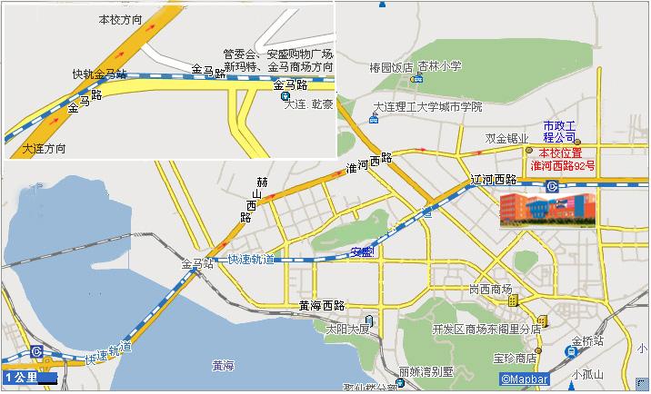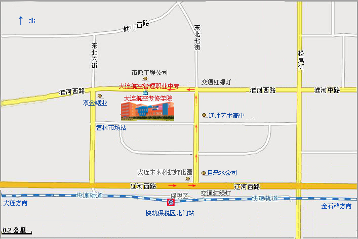 4.从快轨保税区北门站下车出站后向右拐,第一个交通红绿灯处向左拐北行大连未来科技孵化园方向,经辽师艺术高中后至下一个交通红绿灯处左拐,直行约200米左右即到本校。